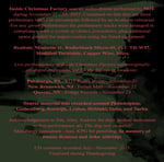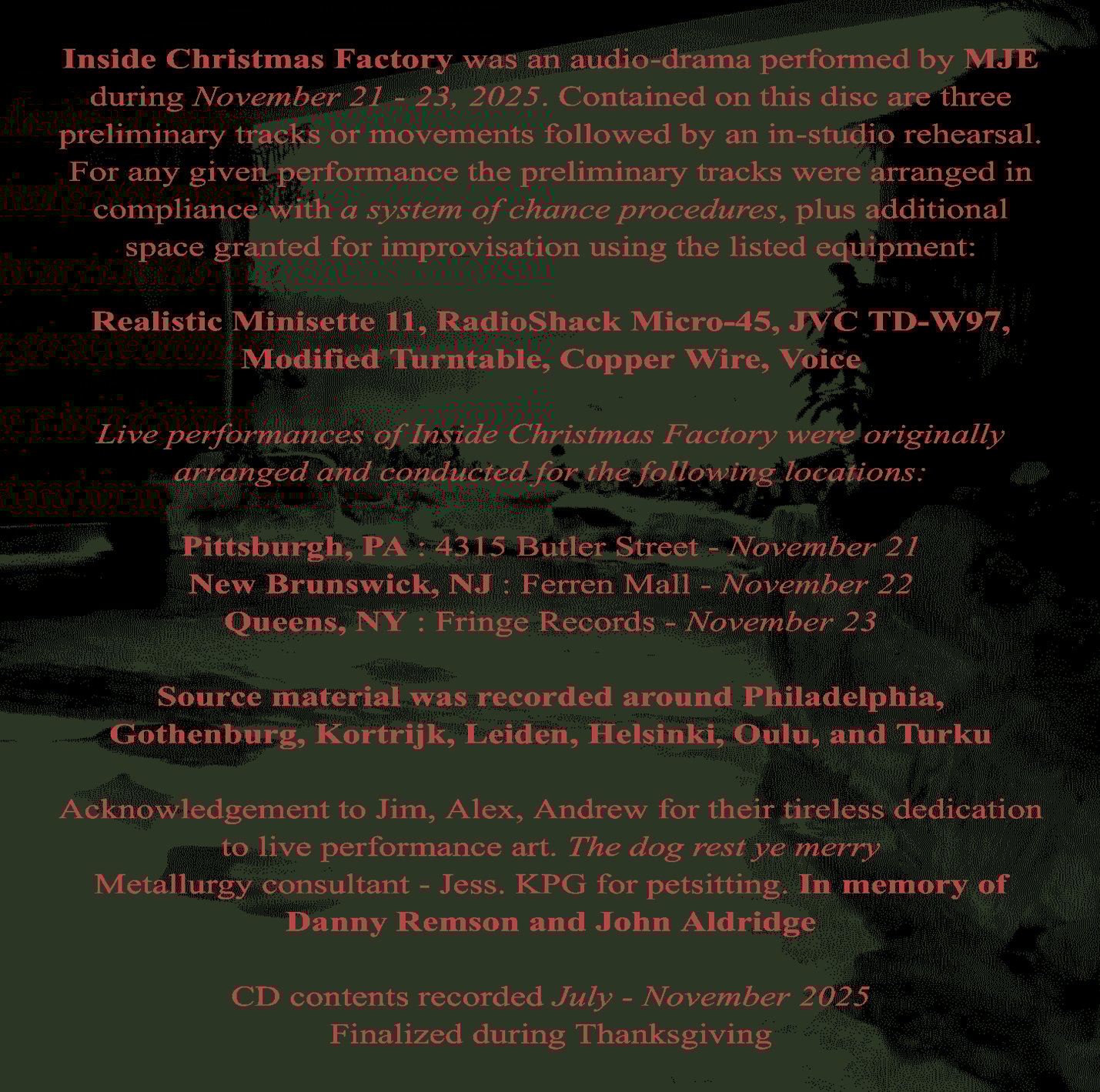 Inside Christmas Factory was a live piece performed by MJE during November 21 - 23, 2025. Contained here are three preliminary tracks or movements followed by an in-studio rehearsal. During each iteration of the performance, the preliminary tracks were ordered in accordance with a system of chance procedure, with additional room for improvisation using the equipment listed below.